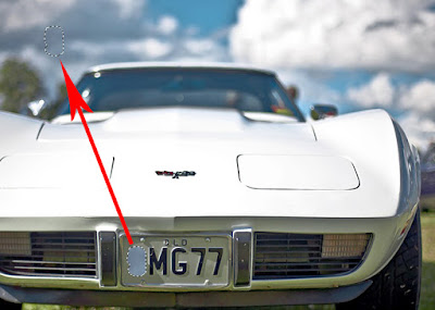 3. Usai melakukan seleksi, masih dengan Patch Tool, arahnya icon (cursor) ke bagian dalam area seleksi, tahan tombol kiri mouse lalu seret bentuk seleksi tersebut ke area lain yang hendak digunakan sebagai objek penambal, kemudian lepaskan tombol. Sebagai contoh, latar dari objek “O” (warna dasar plat) adalah abu-abu, maka di sini penulis menyeretnya ke area sekitar awan yang juga berwarna abu-abu, dan secara otomatis warna abu-abu dari awan pun digunakan untuk menambal objek “O”, kemudian menjadi selaras dengan warna abu-abu dari warna dasar plat. Usah gusar bila tak menemukan area dengan warna yang 100% mirip, tetapi cukup memilih yang termirip, dan selanjutnya Photoshop dapat secara otomatis memperbaikinya.
