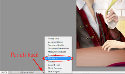 Sebagai contoh, di sini penulis menggunakan sebuah file gambar dengan size mencapai 203 MB untuk memantau performa Photoshop. Secara logika, untuk sebuah file gambar saja, size 203 tentu tergolong sangat ‘bengkak’, dan butuh penanganan khusus untuk mampu mengolahnya. Hal yang perlu dikerjakan pertama-tama ialah memunculkan data Efficiency dari file bersangkutan, dengan cara mengklik sebuah panah kecil yang berada di sekitar sudut kiri bawah gambar, lalu pilih Efficiency.