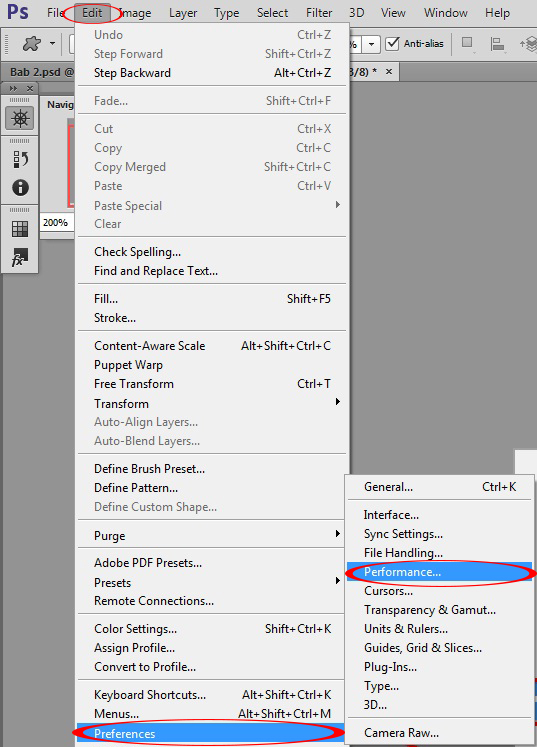 Sebagai part 2 dari tutorial yang membahas soal antisipasi serta solusi error pada Photoshop, di sini kita akan mempelajari cara untuk meningkatkan alokasi RAM bagi Photoshop. Pertama, jalankan Photoshop, lalu klik menu Edit > Preferences > Performance.